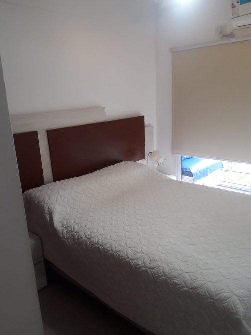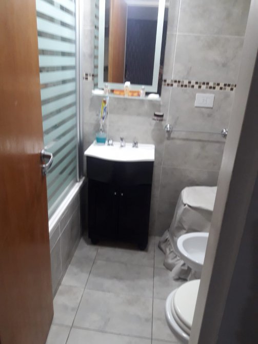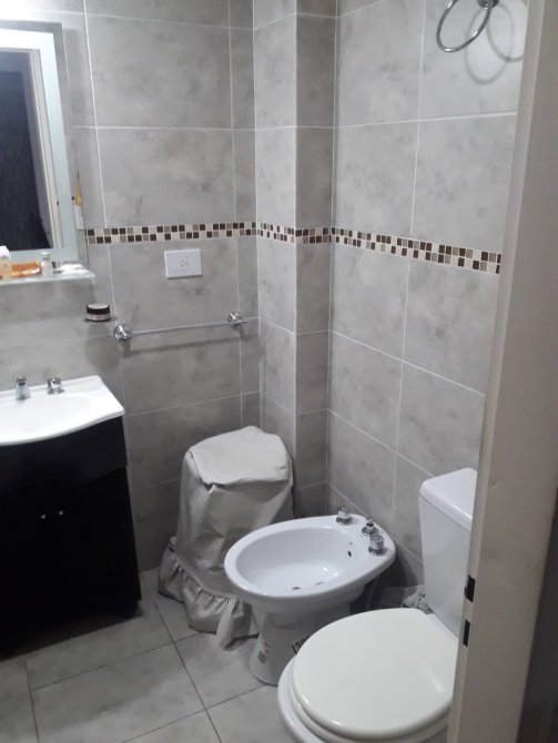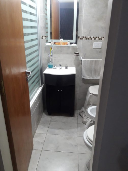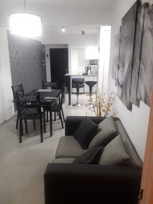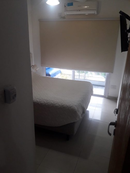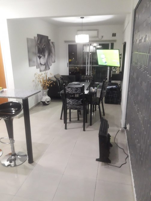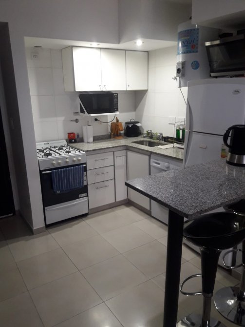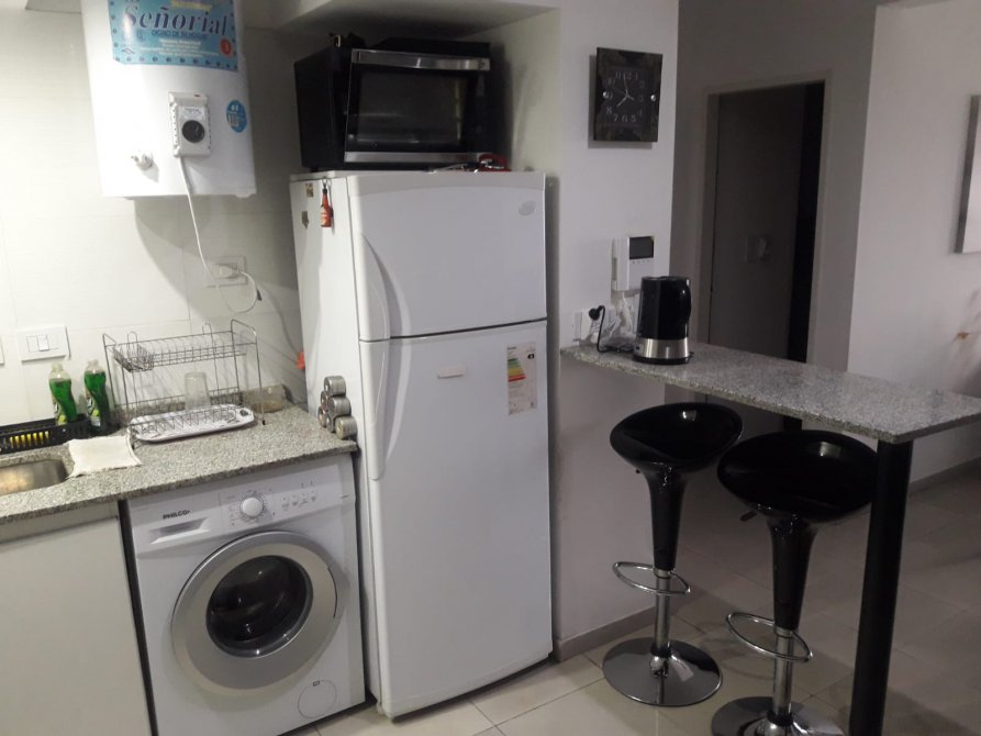 Cocina-living-comedor de 3,10 m x 9 m con bajo y sobre mesada, conexión para lavarropas, termotanque eléctrico, barra tipo desayunador y alacena;