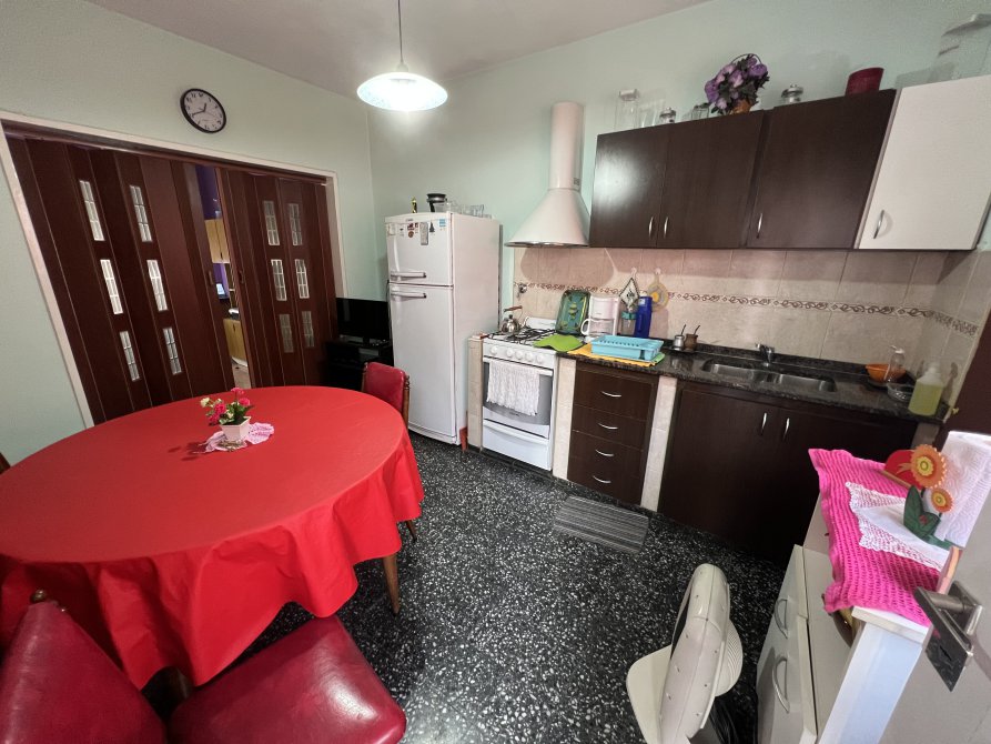 COCINA COMEDOR INTEGRADA AL LIVING (SEPARADA C/ PUERTA TIPO ACORDEÓN) DE 2.80M X 4.05M C/ MUEBLES SOBRE Y BAJO MESADA, PISO DE GRANITO, VENTANA HACIA EL FONDO C/ REJA,PERSIANA Y MOSQUITERO, PUERTA HACIA EL FONDO