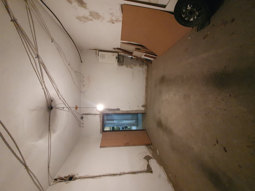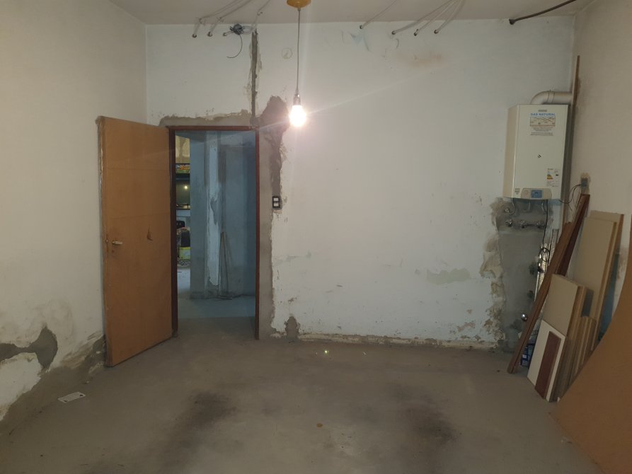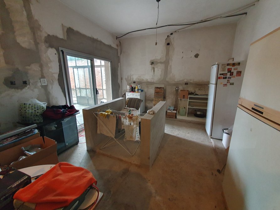 living de entrada de 3,50 m x 9,40 m unificado en “L” con cocina-comedor de 7,50 m x 3,80 m a terminar con todo preparado para poner mesada e isla; baño completo también a terminar (sin instalaciones);