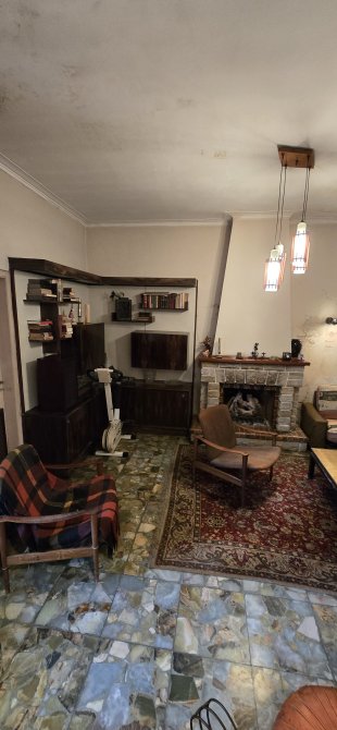 Living de entrada de 5 m x 4,90 m con hogar a gas y pisos de mármol;