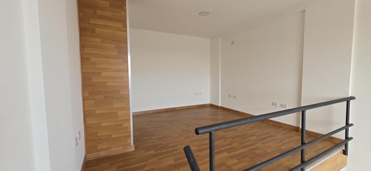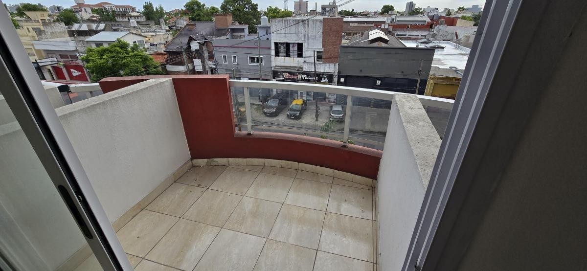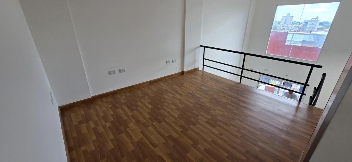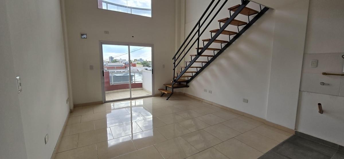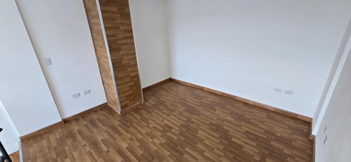 Salida a balcón de 1,90 m x 1,70 m, y escalera a planta alta con dormitorio de 3,80 m x 3,80 m con piso flotante.