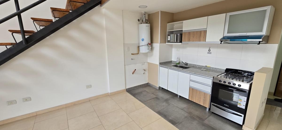 Cocina-living-comedor de 3,80 m x 5,60 m con bajo y sobre mesada, termotanque, conexión para lavarropas;