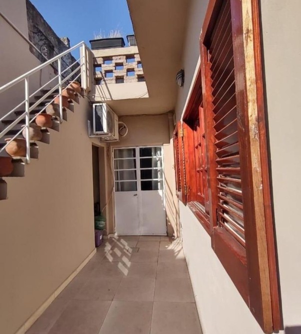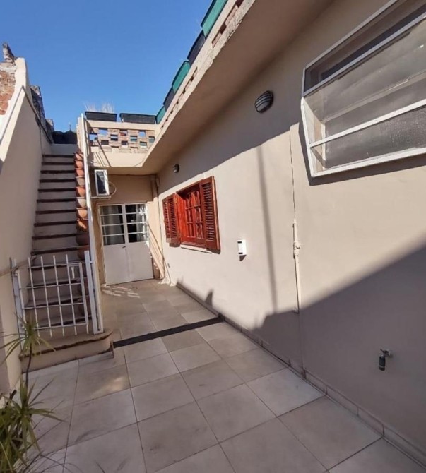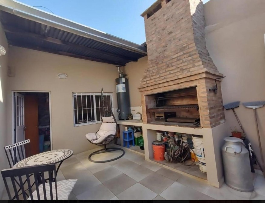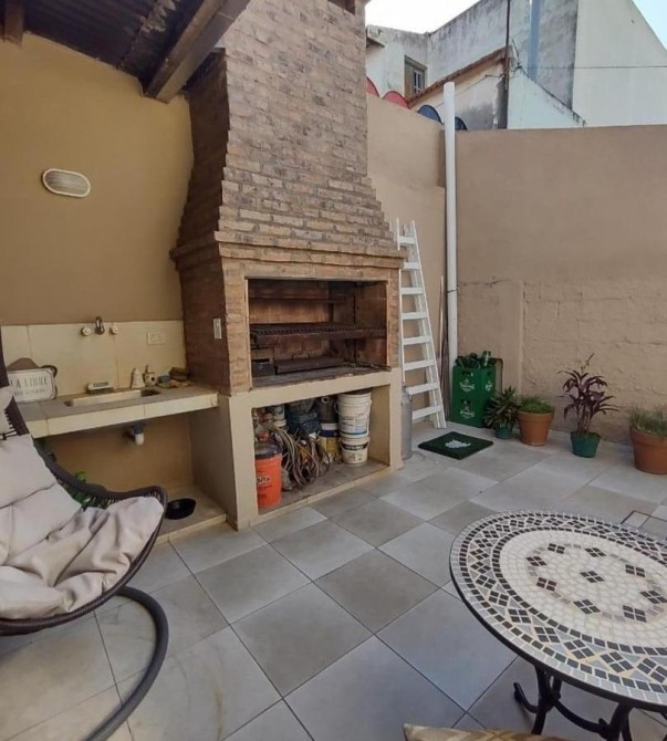Patio en “L” de 5,20 m x 14,60 m con parrilla, mesada con bacha, termotanque y escalera a terraza que abarca toda la casa.