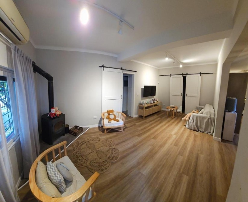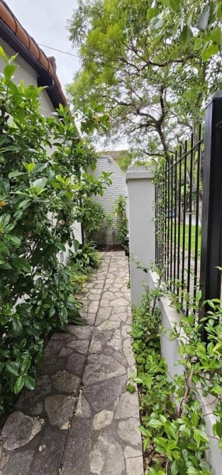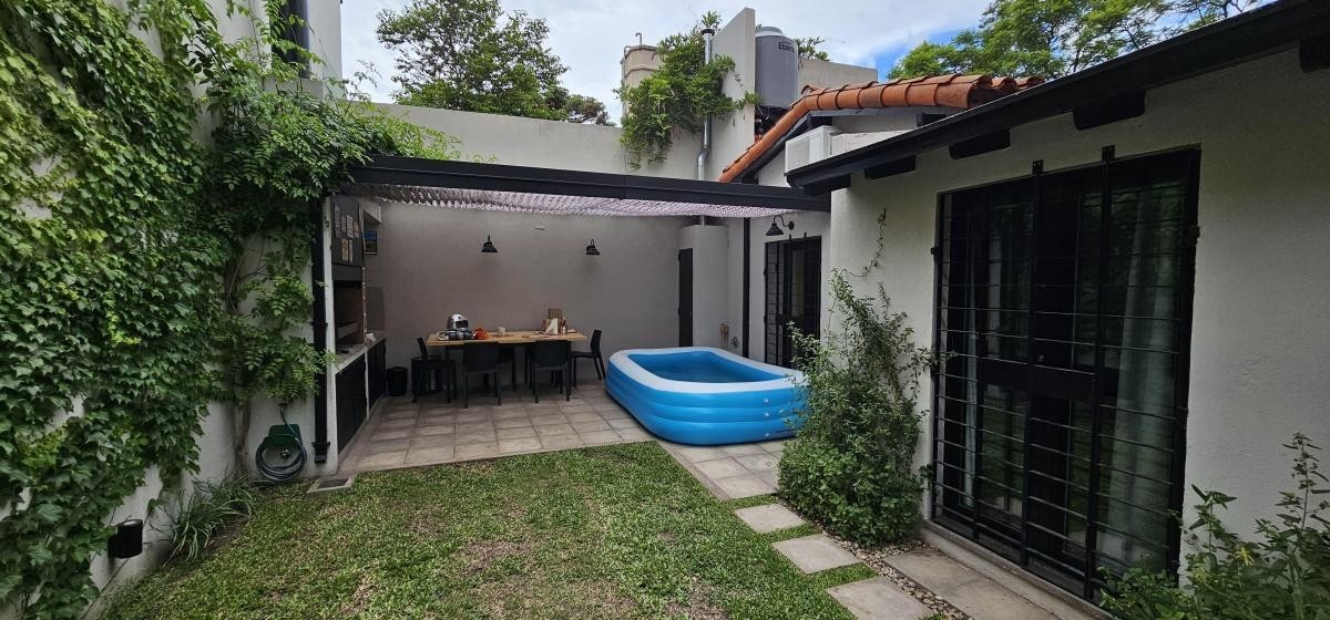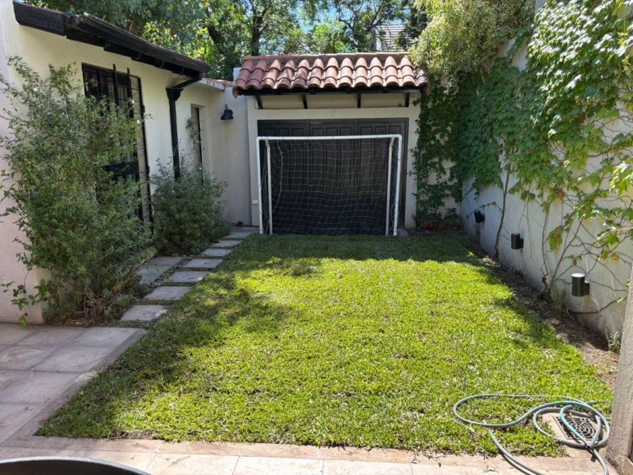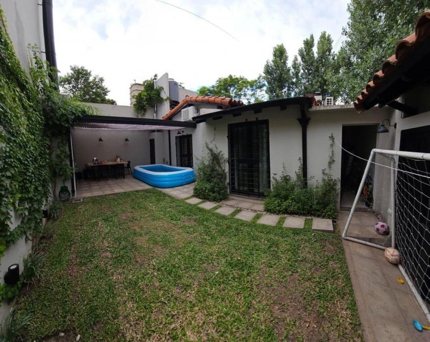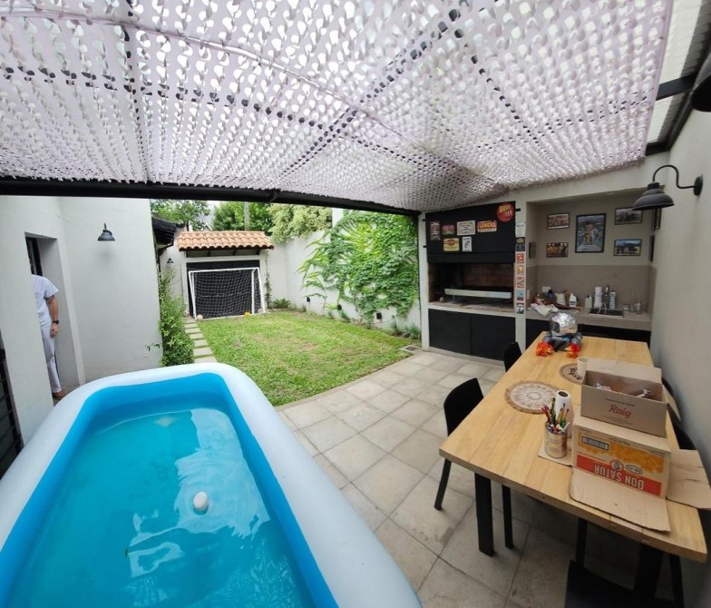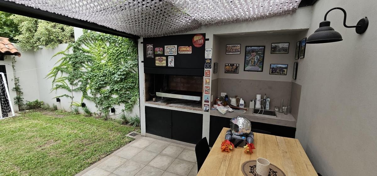 Fondo libre de 5,60 m x 9,60 m con entrada de auto y quincho abierto de 5,60 m x 3,40 m con parrilla y mesada con bacha;