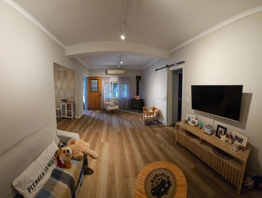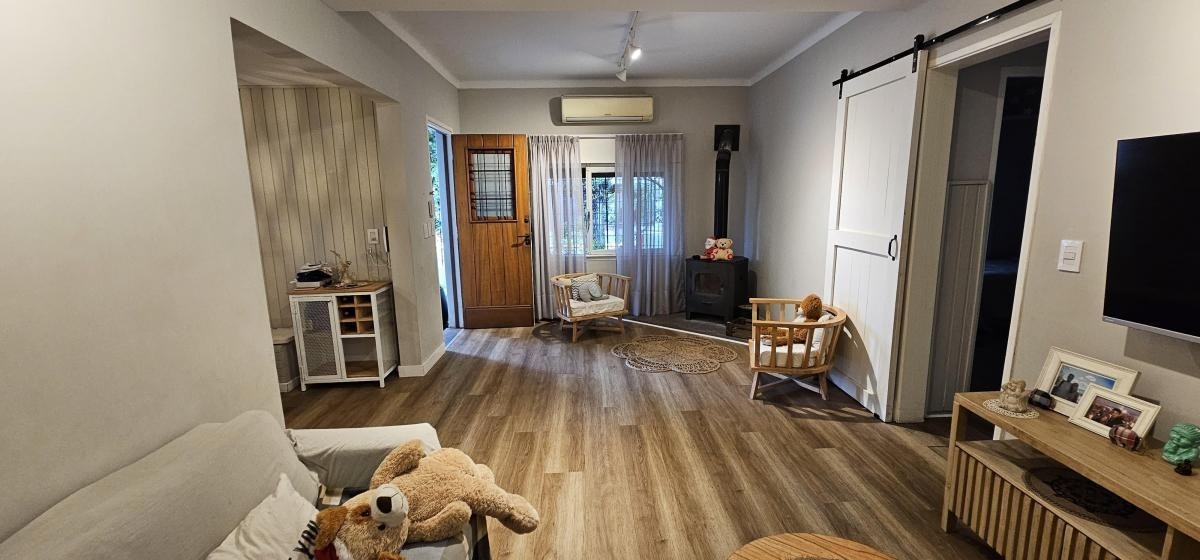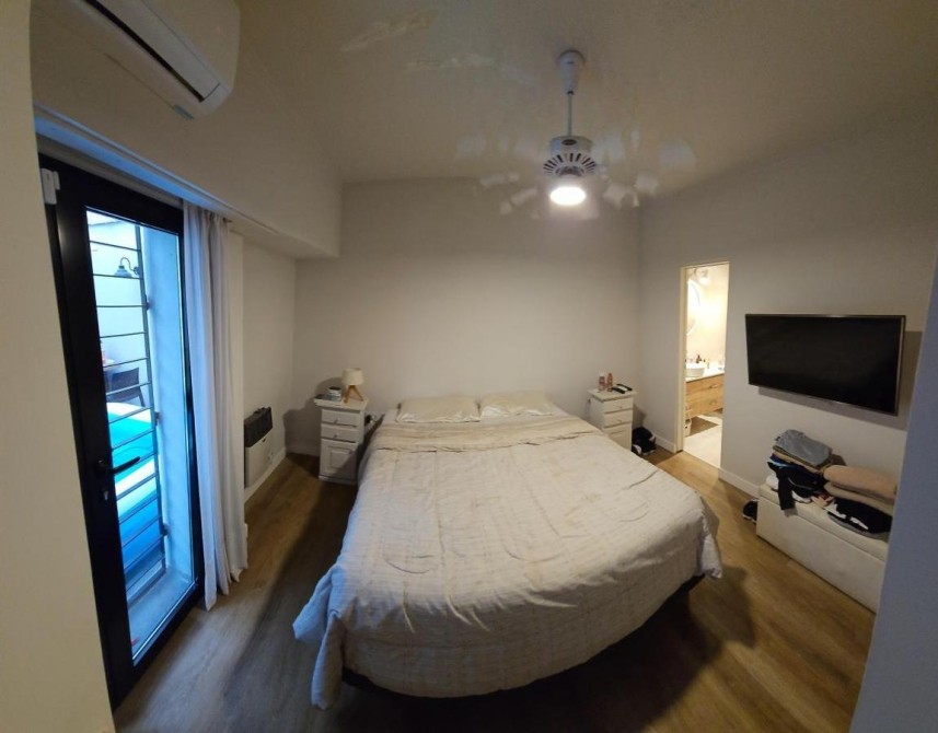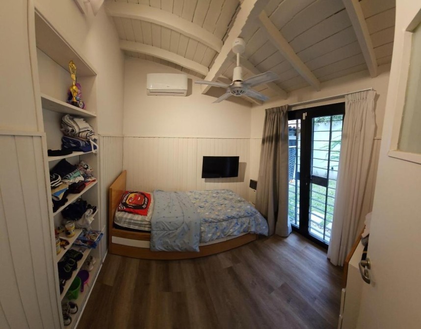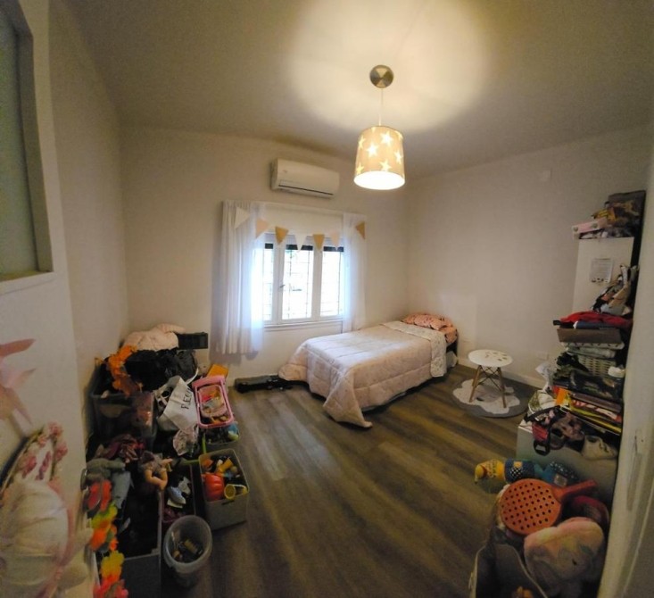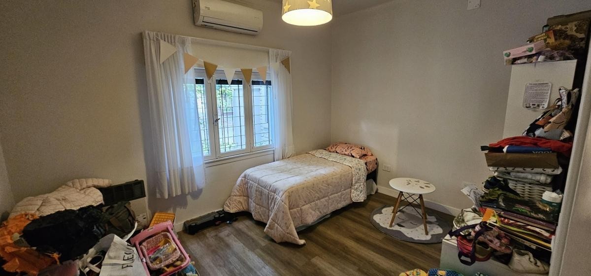 Fondo libre de 5,60 m x 9,60 m con entrada de auto y quincho abierto de 5,60 m x 3,40 m con parrilla y mesada con bacha;