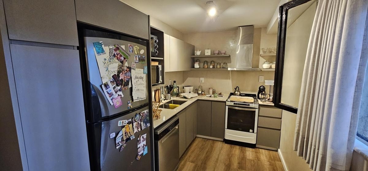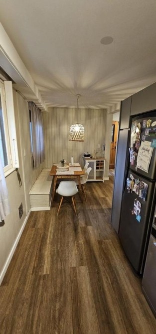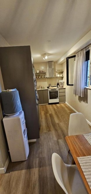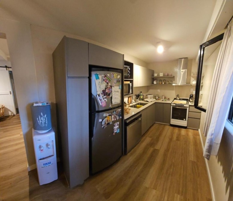 Living de entrada de 3,50 m x 6 m con moderna salamandra, integrado a cocina-comedor de 2,15 m x 6 m con bajo y sobre mesada, todo con pisos de porcelanato;