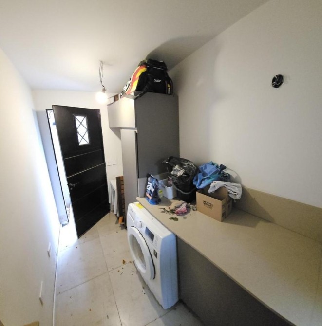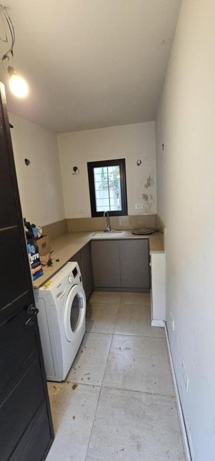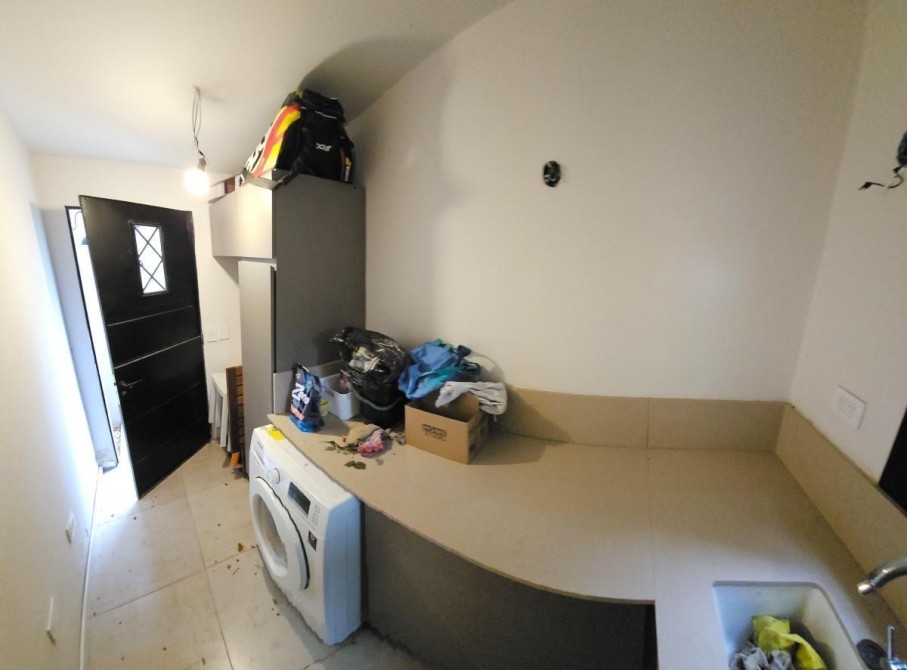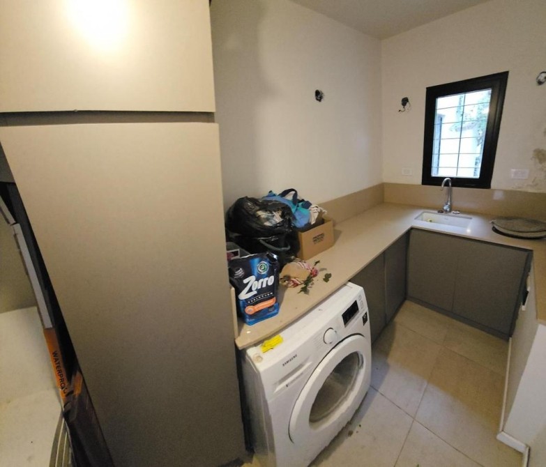 Lavadero cubierto de 1,60 m x 3,30 m con amplia mesada con muebles bajo mesada y espacio para heladera o freezer.